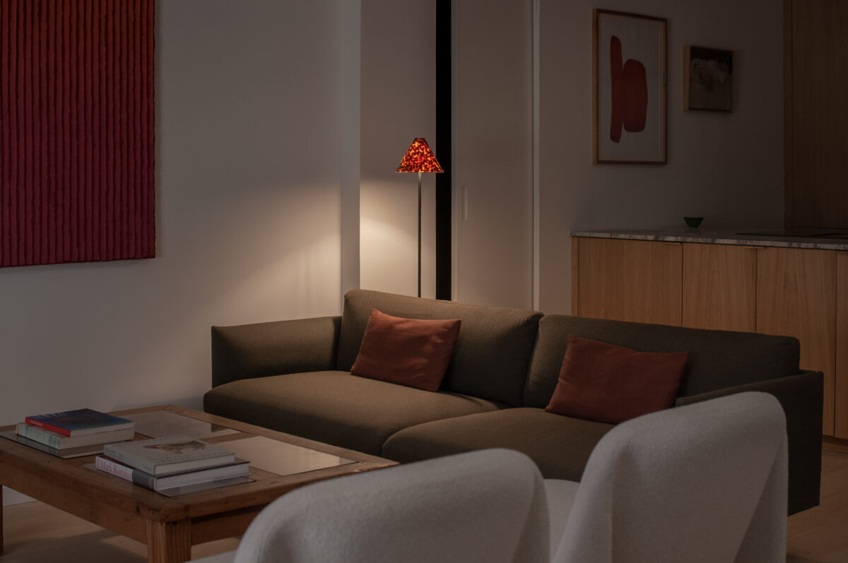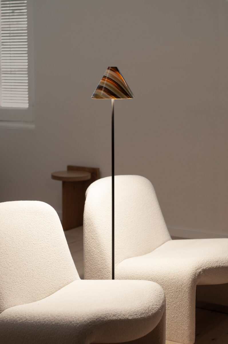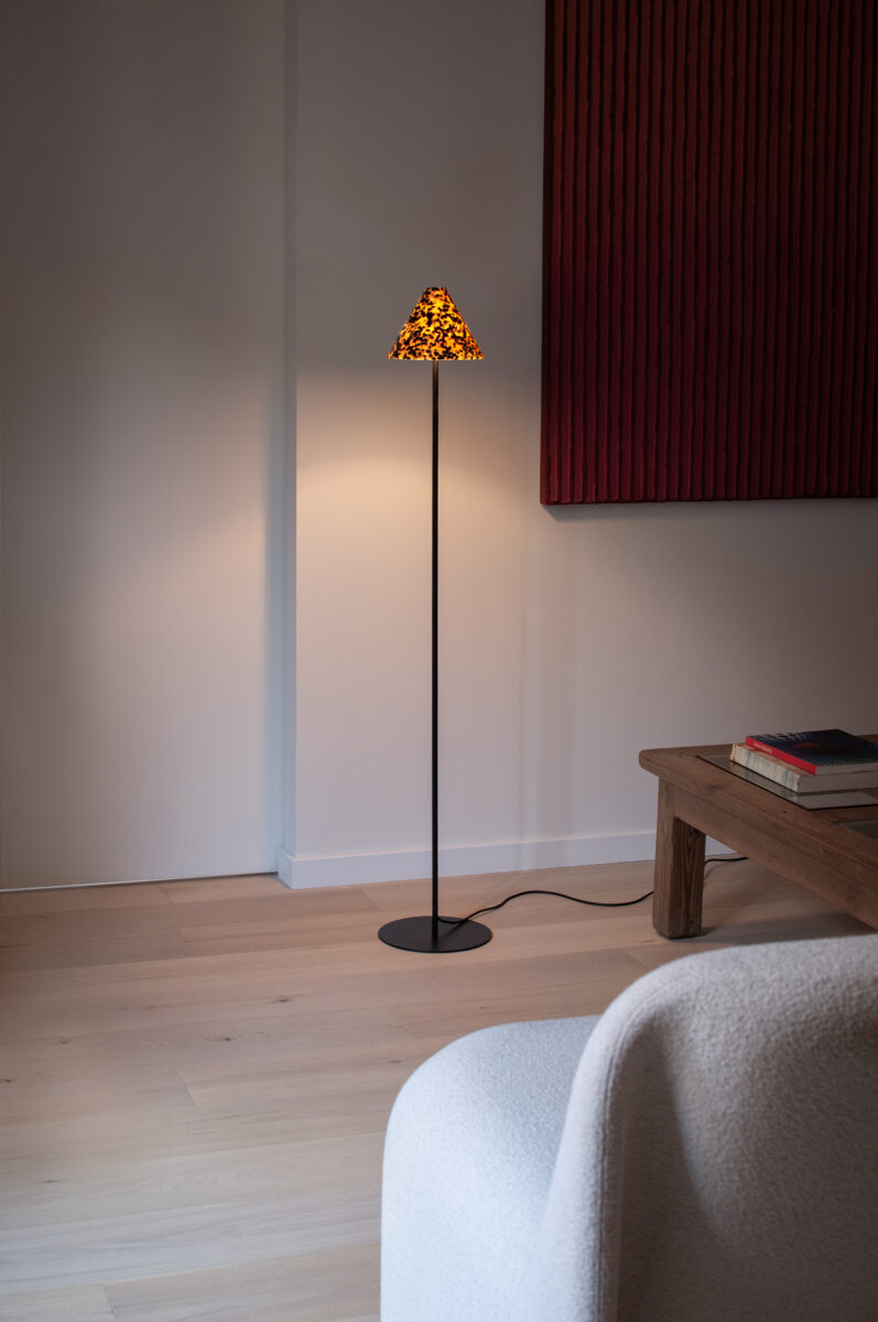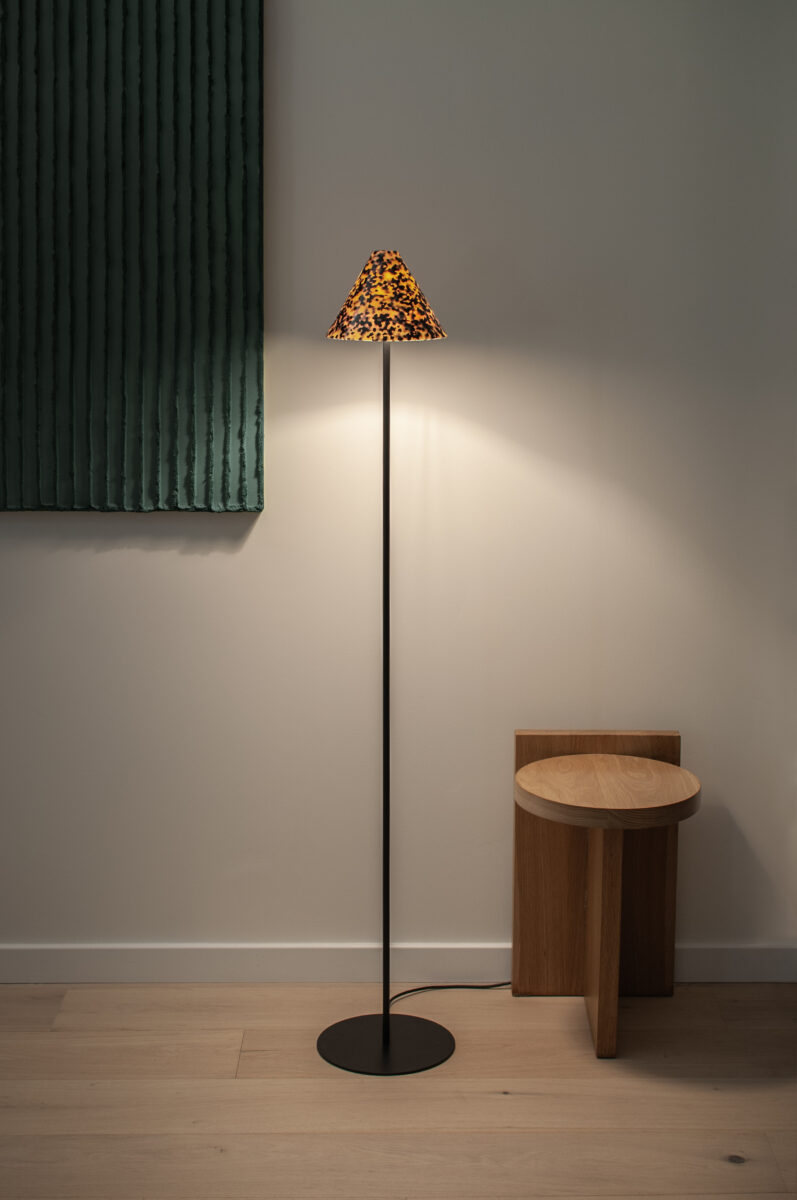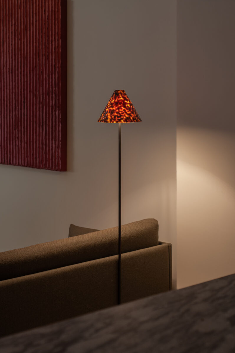 Para Pisco, Álvaro Goula y Pablo Figuera optaron por una pantalla cónica: “el cono es el arquetipo de lámpara, una forma esencial y lógica que nunca pasará de moda”. Además, esta geometría permite que, como las monturas de las gafas, las pantallas se moldeen con calor a partir de formas planas. El proceso, realizado artesanalmente en Barcelona, concluye con un pulido que consigue en el acetato un brillo y transparencia espectaculares.
